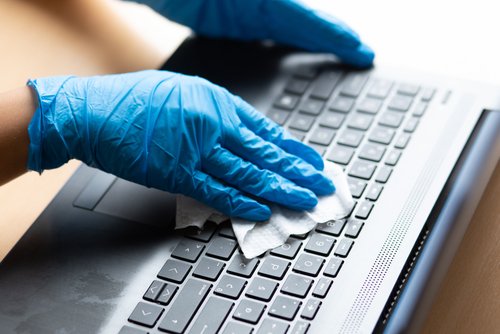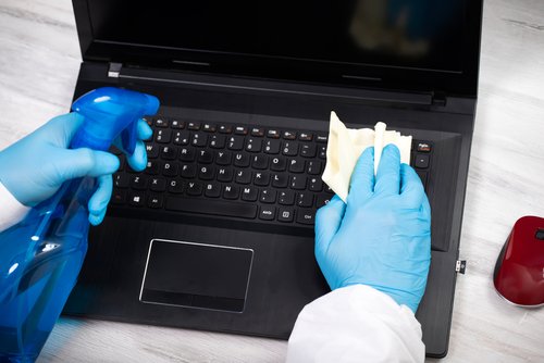 Luego, toma un trapo con un poco de alcohol isopropílico y frótalo en las teclas para eliminar la grasa y la suciedad pegada. Por último, con ayuda de un hisopo humedecido con alcohol, limpia los espacios entre las teclas.